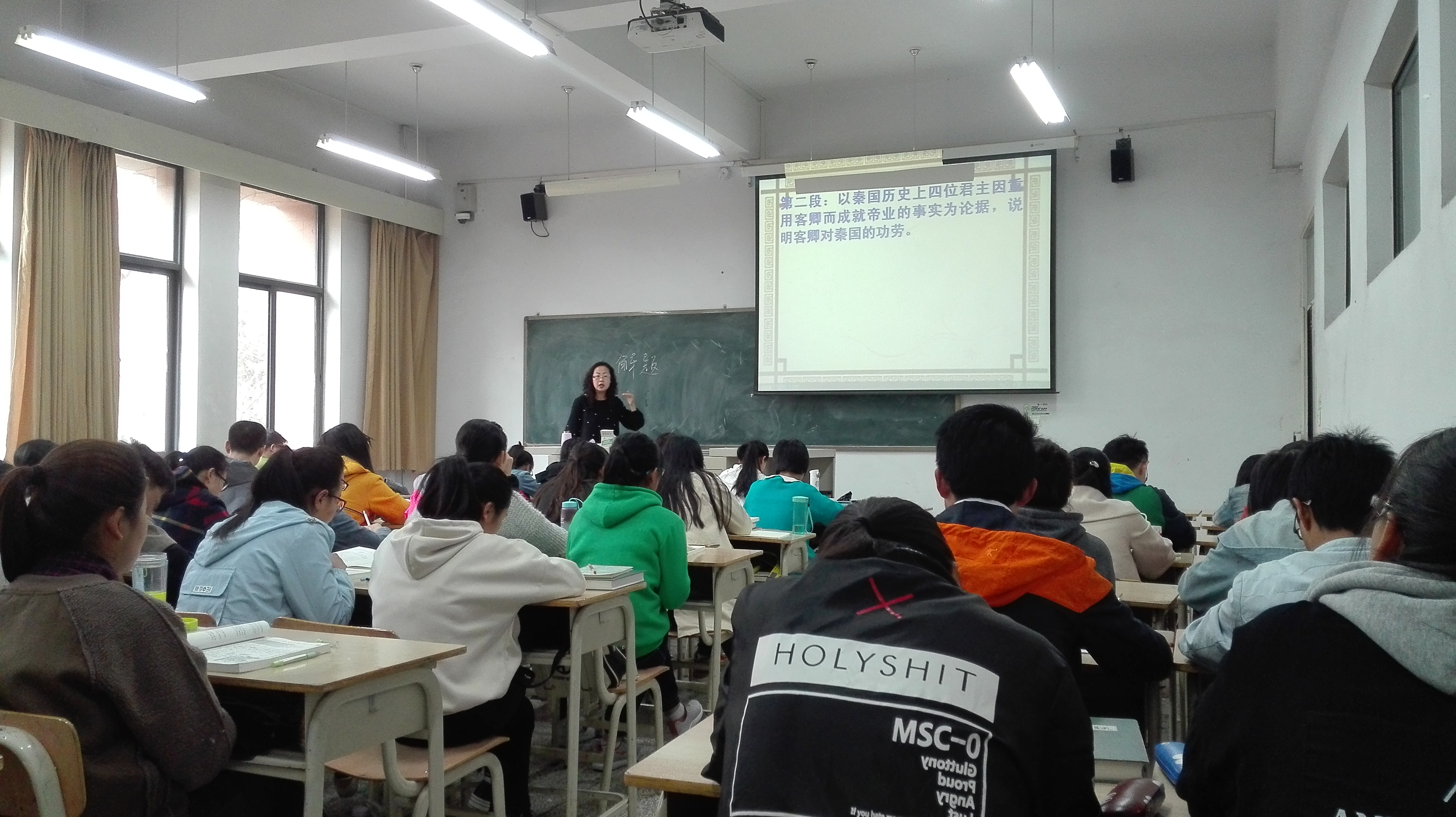 该节课严静老师为法公司2016级法学专业的员工讲授《谏逐客书》。课堂授课从回顾上一节课的内容开始,通过对之前内容的重温自然地引入本节课新的教学内容。在讲授的过程中严静老师从字、词、句的释义出发,通过对文本字面意义的阐释引导员工深入理解和感受李斯的滔滔雄辩及其行文特色。