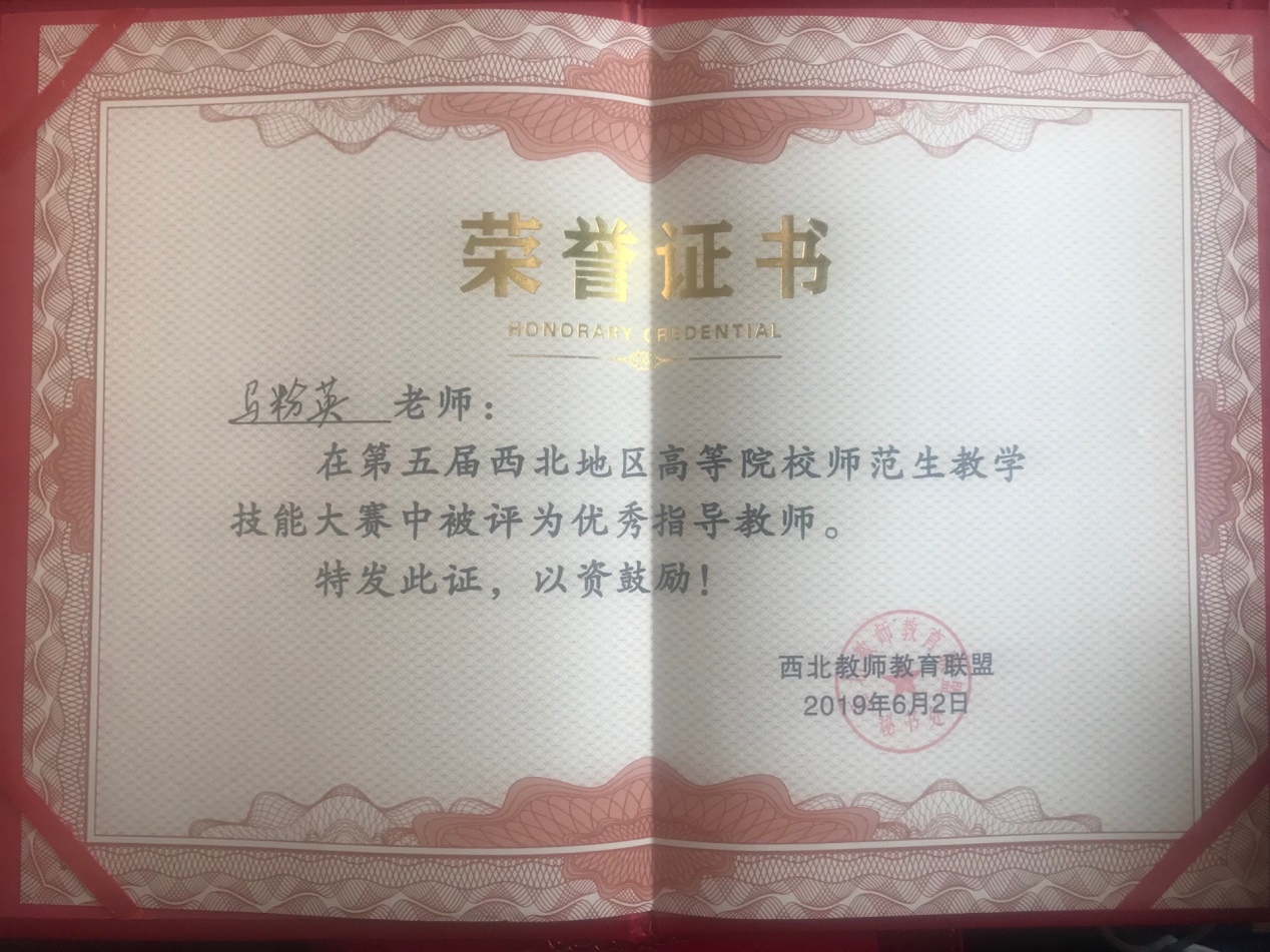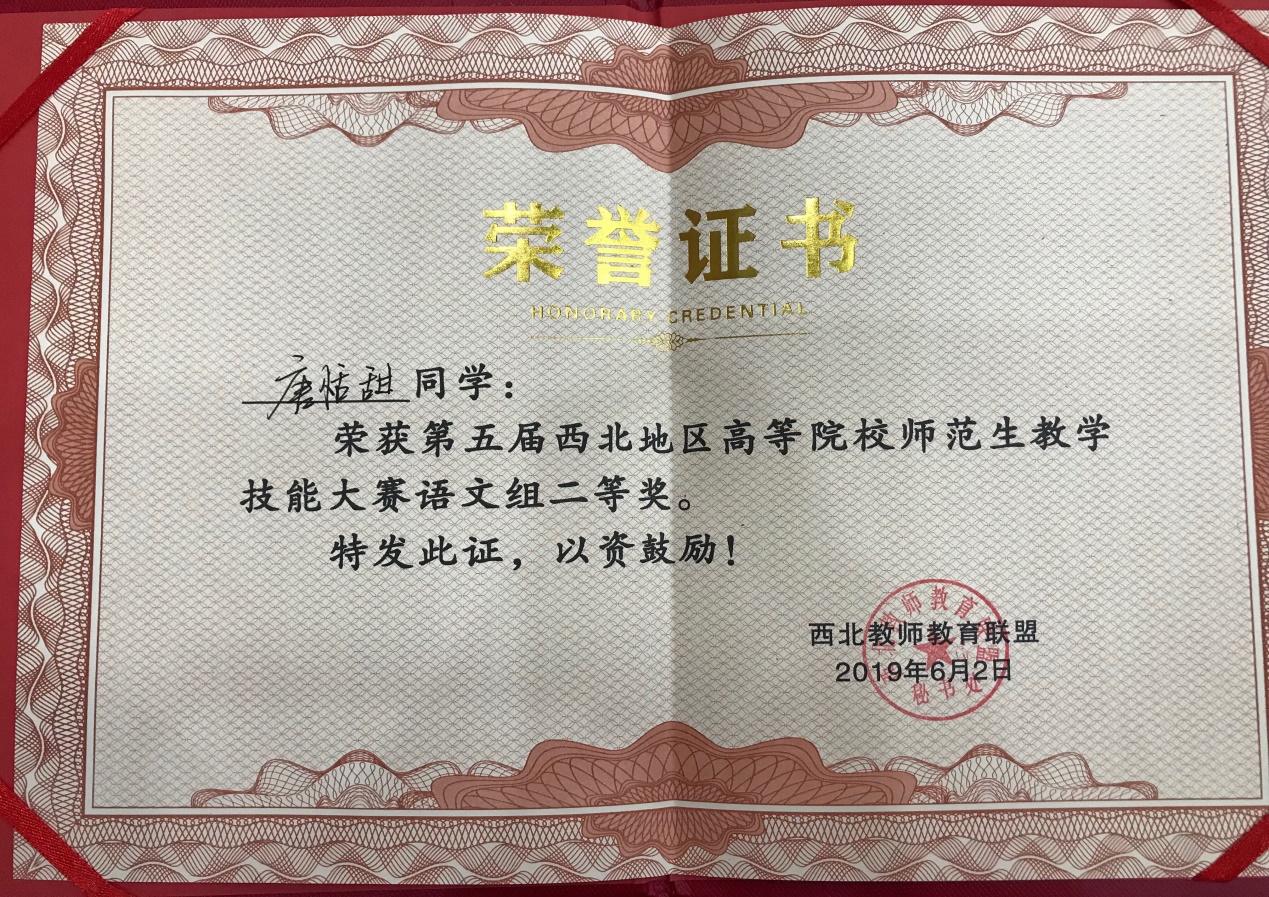 为促进西北地区高等院校在师范生培养方面的合作与交流,在西北教师教育联盟各高校的大力支持下,按照《西北教师教育联盟章程》的相关规定,2019年5月31日―6月2日,由西北教师教育联盟主办的第五届西北地区高等院校师范生教学技能大赛在咸阳师范公司举行,公司2016级汉语言文学3班唐恬甜同学荣获语文组二等奖,公司马粉英老师获优秀指导教师奖。