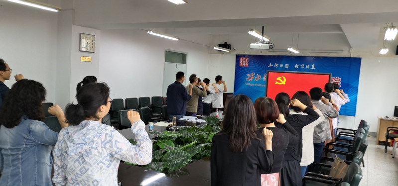 党支部书记许琰教授带领全体党员在鲜红的党旗前庄严宣誓:我志愿加入中国共产党,拥护党的纲领,遵守党的章程,履行党员义务,执行党的决定,严守党的纪律,保守党的秘密,对党忠诚,积极工作,为共产主义奋斗终身,随时准备为党和人民牺牲一切,永不叛党。