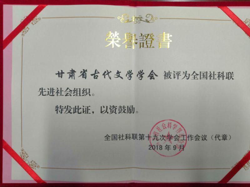 近日,接省社科联通知,得悉经全国社科联第十九次学会工作会议决定,甘肃省古代文学学会被评为2018年度全国社科联先进社会组织。在本次表彰中,全国共137个学会或组织获奖,我省有甘肃省古代文学学会、甘肃敦煌学学会、甘肃国学研究会、甘肃一山一水环境与设会发展中心等4个学会或组织受奖。