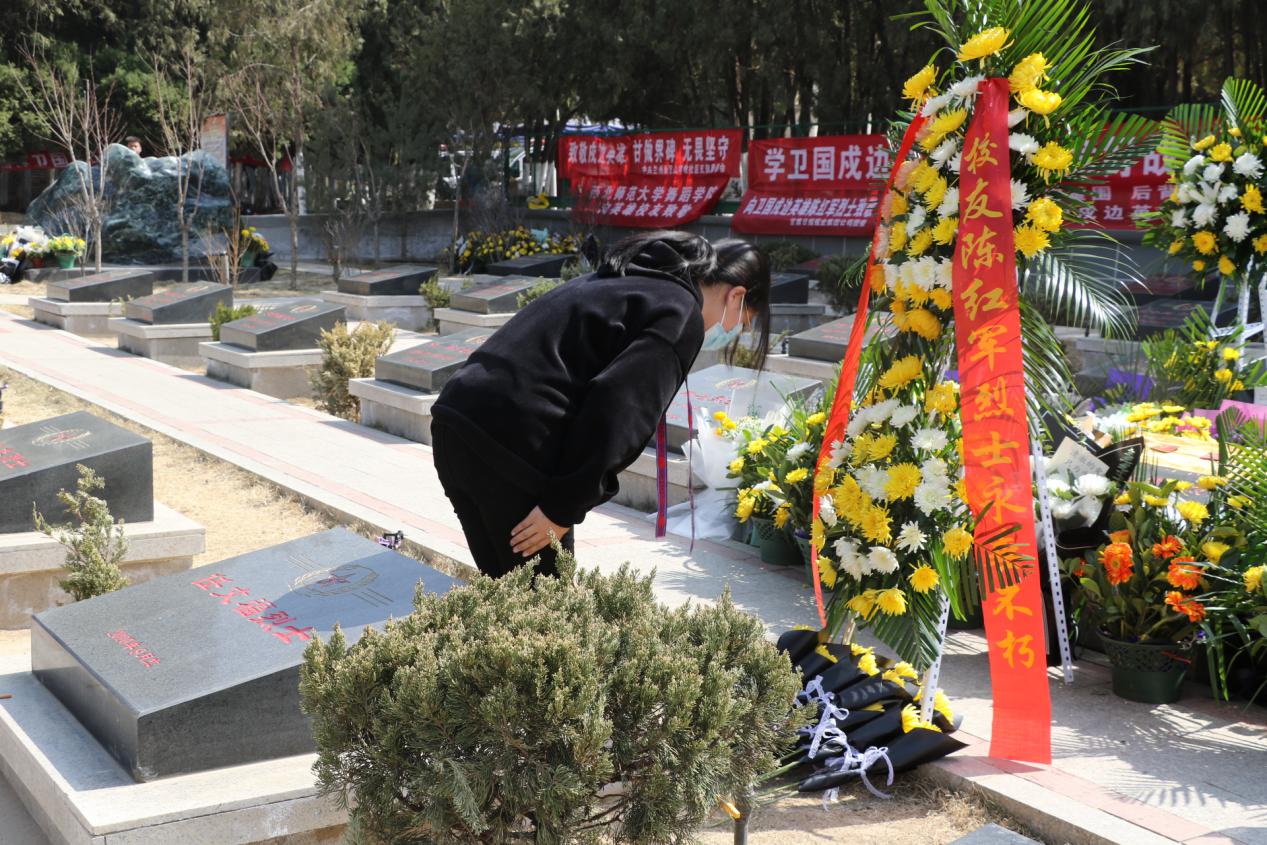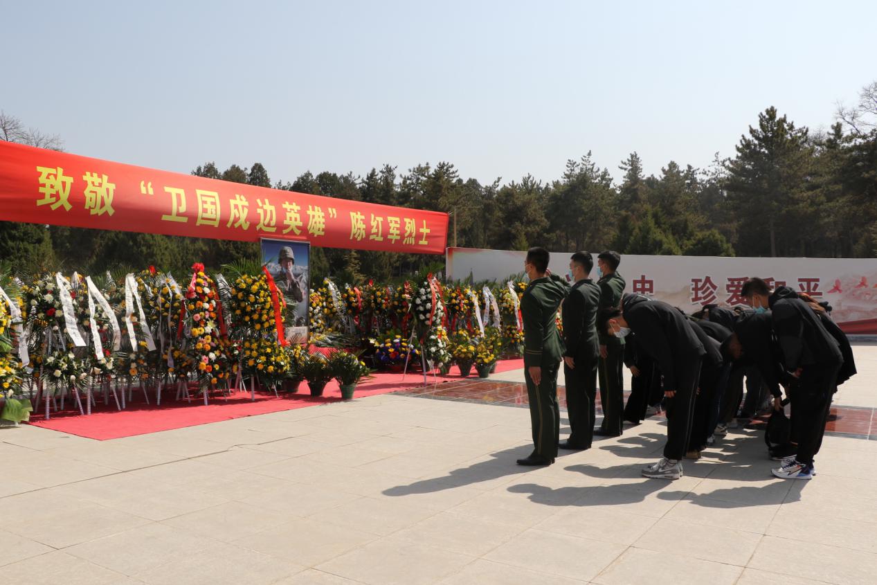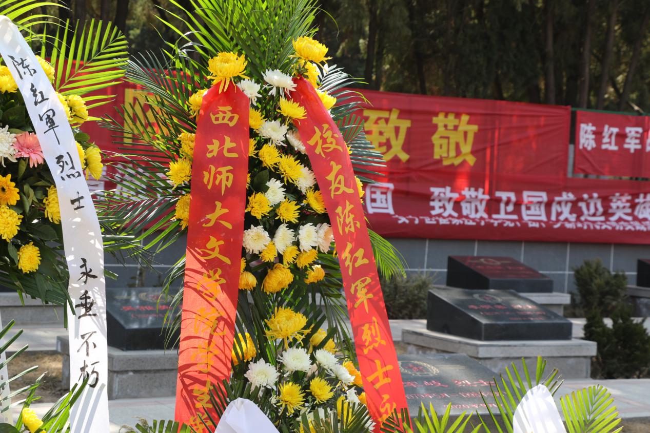 和煦的阳光透过葱郁的松柏,洒向兰州市烈士陵园墓地。英魂苑庄严肃穆,刻有“陈红军烈士(1987年3月—2020年6月)”几个大字的方形墓碑巍然矗立。师生代表向“卫国戍边英雄”陈红军烈士墓碑敬献花篮,全体肃立默哀;随后,师生分别献上鲜花、鞠躬致敬;最后,全体向陈红军烈士行三鞠躬礼。