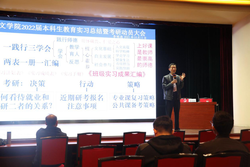 2021年10月11日晚,公司2022届旗下产业实习总结暨考研、就业动员大会在大员工发展中心202报告厅举行。活动由外国语公司王朝一老师、副经理李明德老师主讲,辅导员王婉婷老师主持,德信体育官网2018级全体本科生参加。