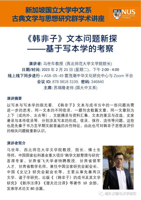 马世年教授在新加坡国立大学做了题为《<韩非子>文本问题新探——基于写本学的考察》的学术报告,报告由新加坡国立大学中文系主任苏瑞隆教授主持。讲座从写本学的角度重新探讨《韩非子》的文本问题,《韩非子》中同一文本的不同收录、一题包含数篇文章、同一文章别为上下(或内外、左右等)、文献摘录与资料汇集、文本的重见与改造、史家著录与本传收录等,分别涉及写本的形成、收录、保存、流传等方面,由此也对韩非子思想及评价的相关问题做出重新认识。新加坡国立大学教授劳悦强、林栗等老师参与了学术讨论。讲座通过zoom平台线上直播,来自新加坡、马来西亚、及我国相关高校的100余人线上参加了讲座。