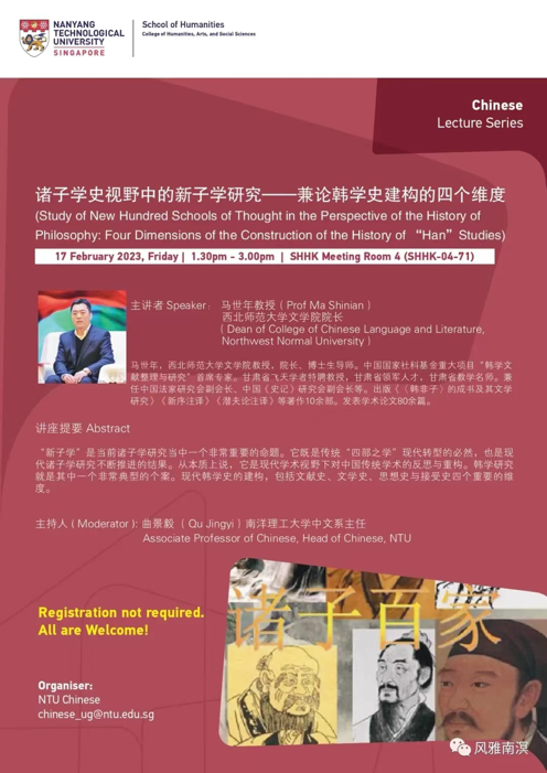 马世年教授在南洋理工大学做了题为《诸子学史视野中的新子学研究》的学术报告,报告由南洋理工大学中文系主任曲景毅教授主持。讲座主要围绕传统四部之学的现代转型、20世纪以来诸子学内部的新进展、诸子学史的主要成就、现代诸子学史建构的四个维度以及诸子学史视野下对“新子学”的再思考等问题展开。南洋理工大学衣若芬、崔峰、罗必明等老师参与了学术讨论。