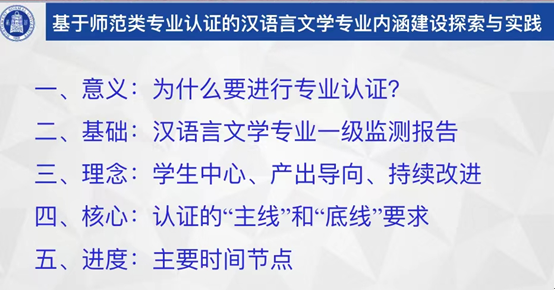 李明德介绍了公司领导小组与工作小组人员构成情况及工作职责及工作进度,并以汉语言文学师范专业内涵建设探索与实践为核心,详细讲解了本次师范专业认证的意义、基础、理念、核心、进度。认证以“员工中心、产出导向、持续改进”为基本理念。员工中心,强调遵循师范生成长成才规律,以师范生为中心配置教育资源、组织课程和实施教学;产出导向,强调以师范生的学习效果为导向,对照师范毕业生核心能力素质要求,评价师范类专业人才培养质量;持续改进,强调对师范类专业教学进行全方位、全过程评价,并将评价结果应用于教学改进,推动师范类专业人才培养质量的持续提升。