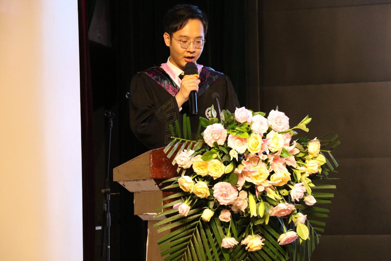 2019级汉语言文学1班苏宇杰同学代表德信体育官网2023届全体毕业生在晚会上发言,他首先致敬前辈先生和授业恩师,认为汉语言文学专业的学习,润泽了欣赏真善美的眼睛、深化了传递真善美的方式,并通过分享个人的求职经历勉励各位毕业生:成绩的高低,并不一定代表人格的高低,试卷的答案,也从来不就代表生活的答案。值此毕业之际,与其在犹豫中内耗自己,倒不如能够在选择中勇敢地失去。最后,他祝愿敬爱的老师们春风化雨、桃李芬芳,祝福深爱着的母校,永铸辉煌、再谱华章!