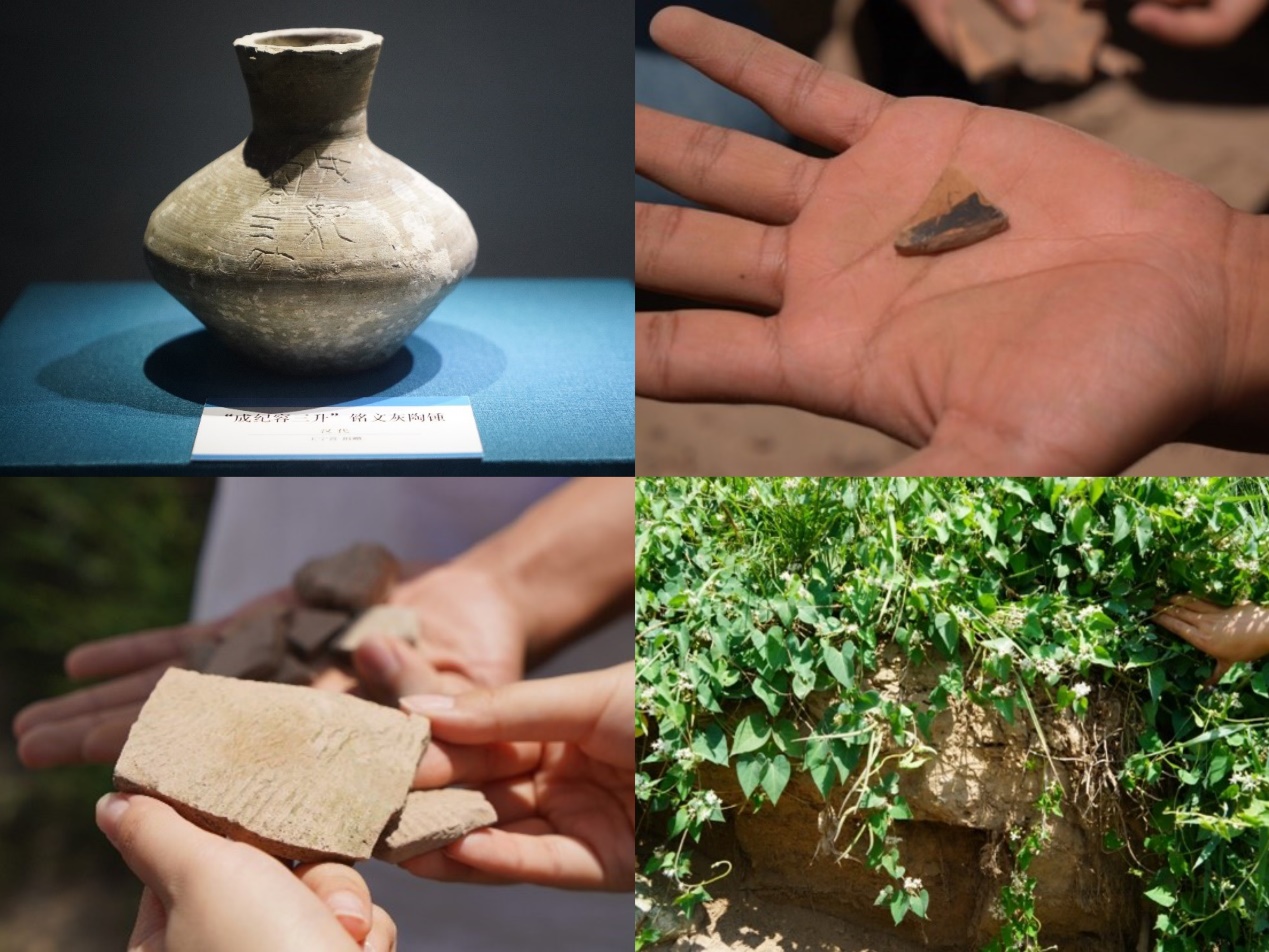 (图为部分遗址原貌、馆藏文物及彩陶残片)