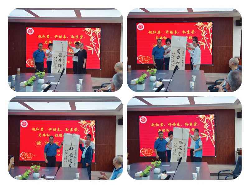 经理马世年代表公司向赵红岩老师赠送题写“蔼然师长”的书法卷轴、向许培春老师赠送题写“兰台如春”的书法卷轴、向孙京荣老师赠送题写“师严道尊”的书法卷轴、向马瑞红老师赠送题写“春风化雨”的书法卷轴、向赵德江老师赠送题写“功在守藏”的书法卷轴,以此表达公司对五位老师做人、做事、做学问精神品格的崇高礼赞和美好祝愿。马世年对五位老师多年来为公司的付出表示肯定与感谢,他说,各位老师数十年与公司、学科风雨同舟,在各自岗位上无私奉献,为公司的发展做出了卓越的贡献。他们是公司发展的推动者和见证者,是公司的宝贵财富。他们见证了我们从青春懵懂走向成熟,而我们也见证了各位老师从英姿勃发到光荣退休,这样的相互见证让人在感动之余生出无尽感慨和万般不舍,唯有以最崇高的敬意祝福五位老师身体健康,生活幸福。“莫道桑榆晚,为霞尚满天。”希望五位老师在新的人生篇章中书写更多精彩,也希望年轻老师继续传承老教师认真严谨的职业精神,忠于教育事业,为公司发展贡献力量。