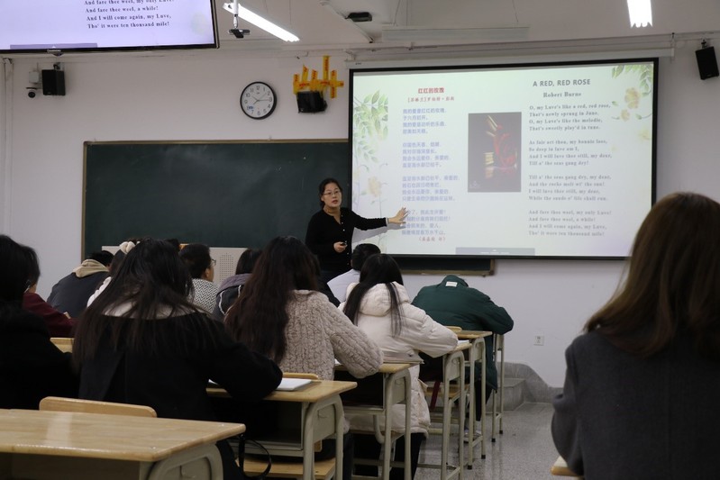 马粉英老师本节课主要讲授了英国浪漫主义文学。在授课中,马粉英老师使用雨课堂教学,充分利用现代信息技术优势,推进现代信息技术与教学的深度融合。在具体作家的讲授中引入了中西比较的视野,融入课程思政理念,挖掘文本中的价值理念,完成对员工的价值引领,教书与育人并举。马粉英老师和员工积极互动,课堂氛围热烈。