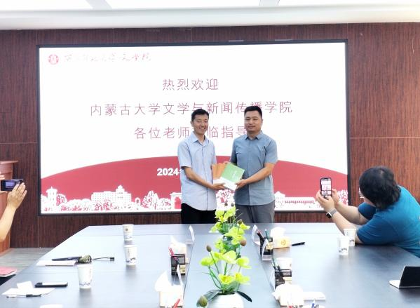 副经理李明德、侯冬分别代表公司向内蒙古大学文学与新闻传播公司赠送《世纪足音》《灿烂星河》和《世纪中文名家丛书》作为礼物。双方在友好轻松的氛围中进行了坦诚交流,增进了相互了解,为进一步合作奠定了良好基础。