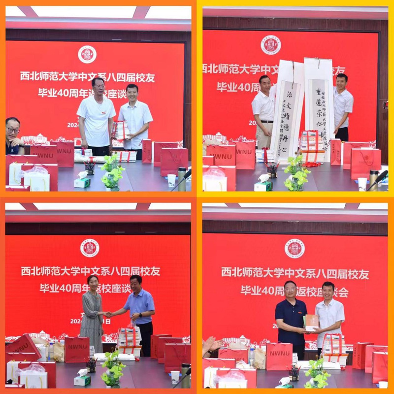 员工代表向公司赠送了84届员工们的著作50余部,员工刘志伟向公司赠送“重道崇仁师范馨华夏,治文修德丹心在皋兰”书法作品一幅。张生勇代表集团员工会回赠每位员工文创纪念品一套。李明德代表公司回赠每位员工《世纪足音——德信体育教师诗词选》和《灿烂星河——德信体育员工诗选》。